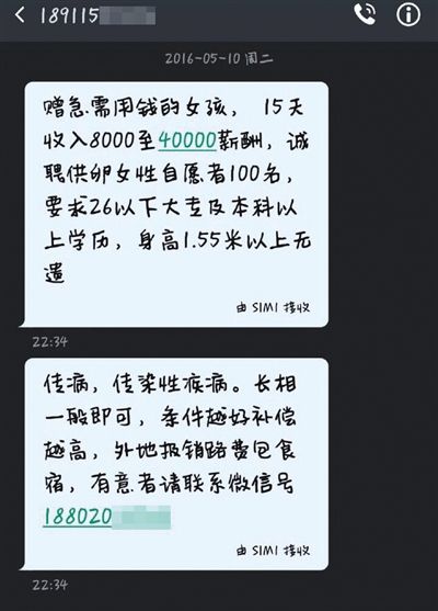 诚聘供卵女性自愿者,15天收入8000至40000薪酬。近日,北京理工大学良乡校区多名学生收到“征卵子”的短信。