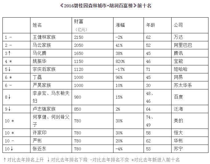 今天(10月13日),胡润研究院公布了《2016年胡润百富榜》,首富是万达的王健林家族,排名第二的是阿里的马云,排名第三位的是腾讯马化腾。在前十名排位中,基本没有太大变化,其中姚振华成为最大“黑马”,排名升至第四位。前十名上榜门槛比去年提高20%,达到780亿。