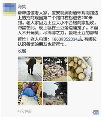 一直到11月14日,事情突然出现转机。马大爷和薯仔堆的相片开始在微信朋友圈疯狂流传,网友们纷纷在朋友圈里替马大爷叫卖薯仔,让爱吃薯仔的朋友都去帮帮忙。