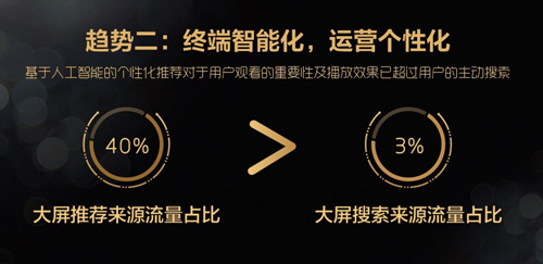 根据阿里的报告显示,现在的用户更倾向于首页的智能推送,而不是自主搜索内容。而阿里作为大数据行业的领头羊,在推送这项技能上可谓占尽了优势。李捷表示:“在阿里大数据分析的基础上,阿里家庭娱乐大数据库分析能更全面地了解用户的观看喜好,让每个用户都有自己的专属大屏内容,形成千人千面的精准推送。