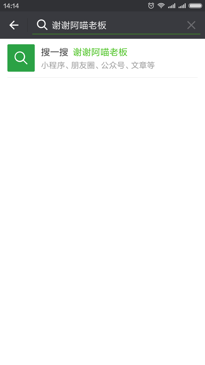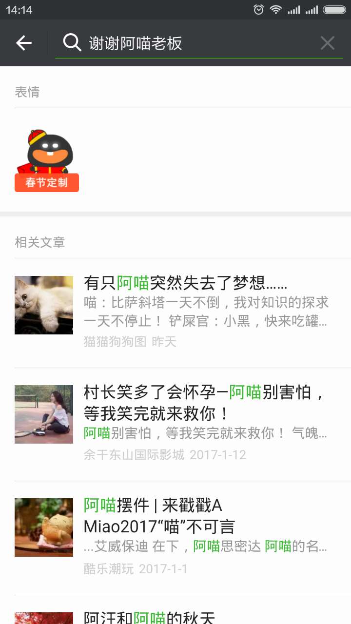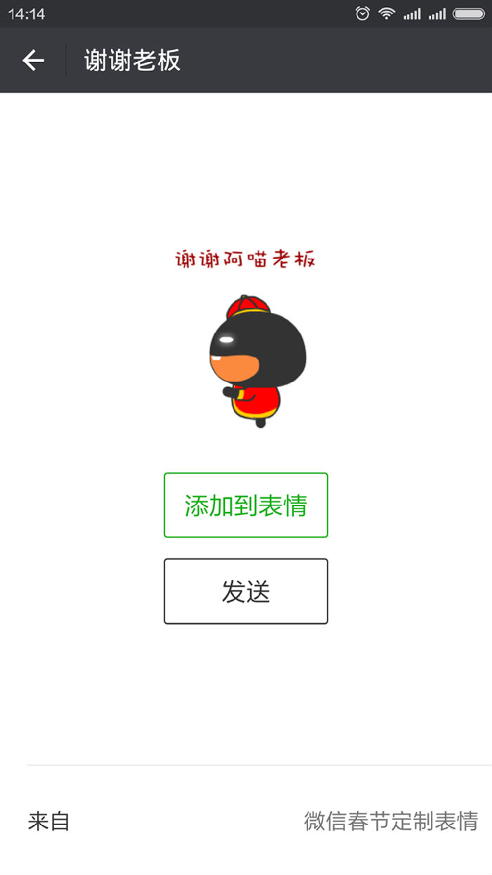 例如:在【搜索】中输入【谢谢XX老板】,“XX”内容为自定义,然后点击显示出的搜索条—【谢谢XX老板】,即出现【春节定制】的图标,点击后即可生成自己的表情啦。