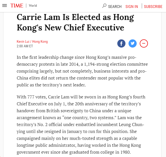 获得777票,林郑月娥将于7月1日(香港主权从英国转交给中国的二十周年)宣誓就职香港第四任行政长官,在被称为“一国两制”的方式下。林郑月娥曾经是香港的“第二号官员”,位于处境艰难的现任执行长官梁振英权力之下,直到她在一月份的时候为了竞选提出辞职。她竞选中主要靠的是大肆吹捧自己长期担任公共行政官员而有的能力----自从她1980年大学毕业后就一直为香港政府工作。