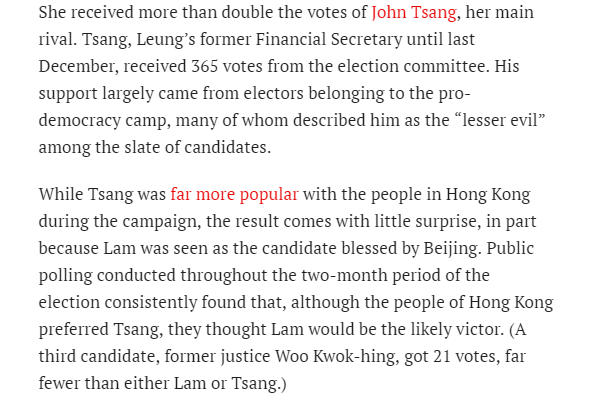 这场选举是从香港二零一四年底的大规模民主抗议活动以来的第一次,一个主要由商界人士和支持中国的精英人士组成的1,194人的选举委员会,并没有使林郑月娥的竞争对手成为香港的新任领导,即使他受到香港群众的支持更多。