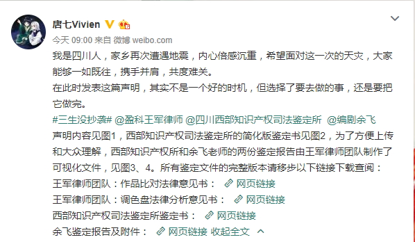 这样看来,唐七的司法鉴定书某种程度上更像是对粉丝的安抚,并不能很好地自证清白,同时选在地震发生后公布,难免有蹭热度之嫌,不怪连某些路人网友都觉得不舒服了。