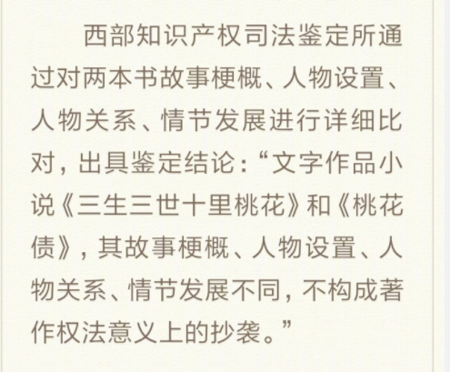 趋势网(微博|微信)讯:针对作品《三生三世十里桃花》被指抄袭《桃花债》一事,作者唐七今日上午在其微博发布司法鉴定报告以自证清白。
