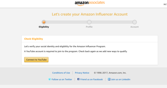 该新工具专门针对想要通过亚马逊审阅渠道的YouTubers。 点击“开始使用”后,申请人将通过几个步骤以验证他们的社会影响度和资格。 该工具指出,YouTube帐户需要关联,但将来会添加其他判断资格的方式。