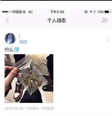 3. 吸毒。有网友爆料pgone吸毒,证据是此前被曝出的疑似吸毒视频以及在PG One被曝的陌陌账号中有晒出毒品的图片,并配文“约么”疑似邀约一起吸毒。该账号注册时间超过四年,期间发过各种各样pgone本人的照片,是本人帐号的可信度高。而之后仿佛坐实这一爆料般,就在网友爆料后不久,该陌陌账号开始狂删消息状态,几乎全程在线,网友怀疑“难不成删了一夜”,是“做贼心虚了”。