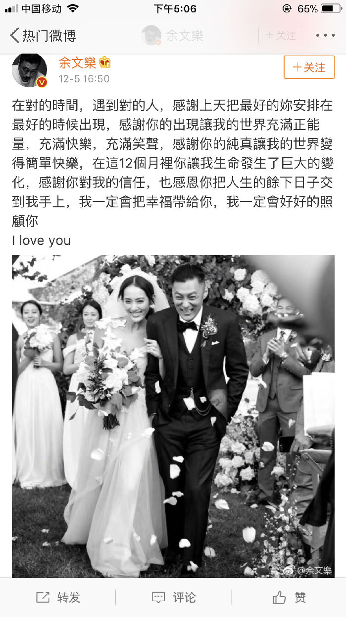 今日下午,余文乐在INS上的发(感)文(动)并晒出结婚照,从照片中可以看出,新郎新娘笑的很开心!据悉新娘王棠云是台湾皮带大王千金,一名妥妥的富二代。去年12月爆出两人在美国约会,今年又有许多传闻说王棠云父亲破产,余文乐携百万提亲不嫌弃女友家庭欠债。今日又突然举行婚礼,果然是真爱啊!