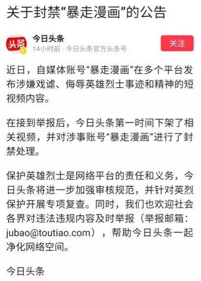 今日头条官方头条账号昨天发布一则《关于封禁:暴走漫画的公告》,《公告》显示:近日头条在接到相关举报后,封禁“暴走漫画”头条账号;封禁的原因是:暴走漫画在多个平台发布涉嫌戏谑、侮辱英雄烈士事迹和精神的短视频内容。