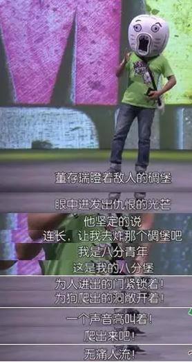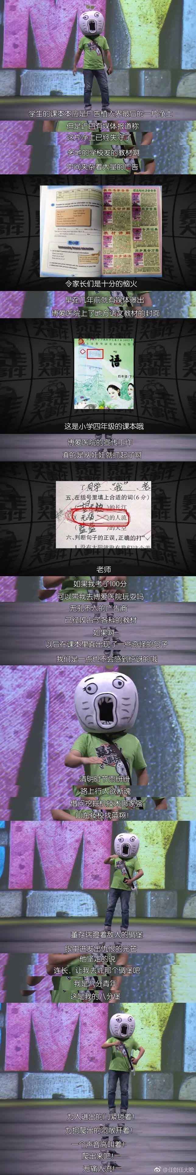 看过完整截图,原来这期节目王尼玛在抨击学生课本上的广告植入。在引述了几个现实案例后,为了讽刺这类现象,王尼玛脑洞大开,为杜牧的诗《清明》、《董存瑞炸碉堡》、叶挺将军的《囚歌》分别植入了蓝翔技校、八分堡和无痛人流的广告。