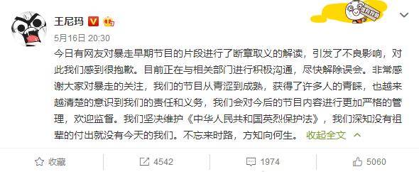 王尼玛表示,“网友对早期节目的片段进行了断章取义的解读,引发了不良影响,对此我们感到很抱歉。目前正在与相关部门进行积极沟通,我们会对今后的节目内容进行更加严格的管理,欢迎监督。我们坚决维护《中华人民共和国英烈保护 法》,我们深知没有祖辈的付出就没有今天的我们。”