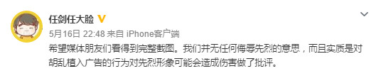 也许是担心完整截图大家看不到,任剑昨晚11时再度更新微博,“希望媒体朋友们看得到完整截图。我们并无任何侮辱先烈的意思,而且实质是对胡乱植入广告的行为对先烈形象可能会造成伤害做了批评。”