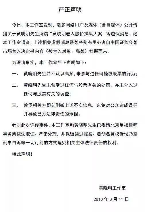 但是官方并没有指出“黄某明”就是黄晓明,黄晓明方面也从没承认过,但娱乐圈从来都是自带热点的地方,媒体们也从不轻易放过,因此各种有关黄晓明卷入18亿股票操纵案的信息被曝出。8月11日,黄晓明工作室发表声明,称黄晓明并不认识高勇,也未参与过任何操纵股票行为和介入过任何相关调查,并表示上述提到的媒体报道为杜撰而来,将追究法律责任。在官方声明下,此事终于有了短暂的平息,但今天,又有一则重磅 新闻 曝出,狠狠打了黄晓明方的脸。