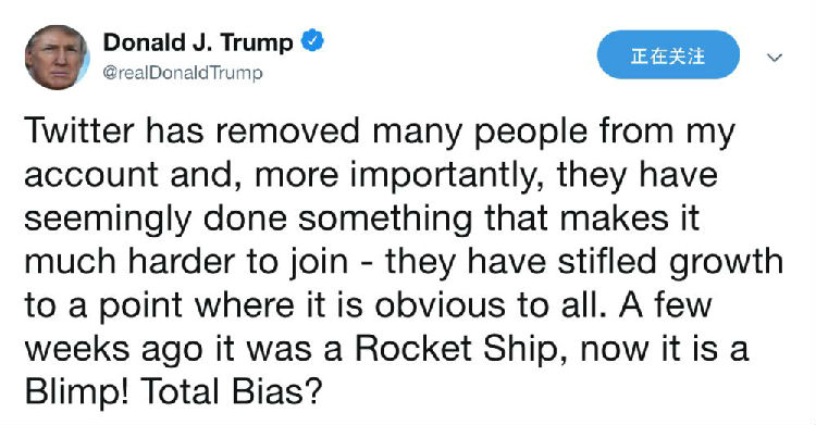 可能受到此次炸弹包裹事件或是其他事件影响,特朗普在26日发文指责推特对他存在偏见,删除其账号的粉丝,他表示推特已经从他的帐号上删了很多人,更重要的是,他们似乎增加了订阅难度,他们抑制他的推特账号的订阅增长。几个星期前速度还是艘火箭飞船,现在变飞艇了!这都是偏见吗?