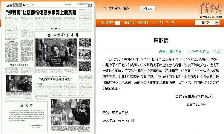 今日,“暴走漫画”所在的西安摩摩信息技术有限公司,在国家级媒体上刊登道歉信。道歉信称,这“不仅给叶挺烈士近亲属造成了精神痛苦,也伤害了社会公众的民族和历史感情,对此我们深感内疚和悔恨”。公司向叶挺烈士近亲属及社会公众致以最诚挚的歉意,并承诺在今后的网络创作中定当尊重历史、弘扬正气。