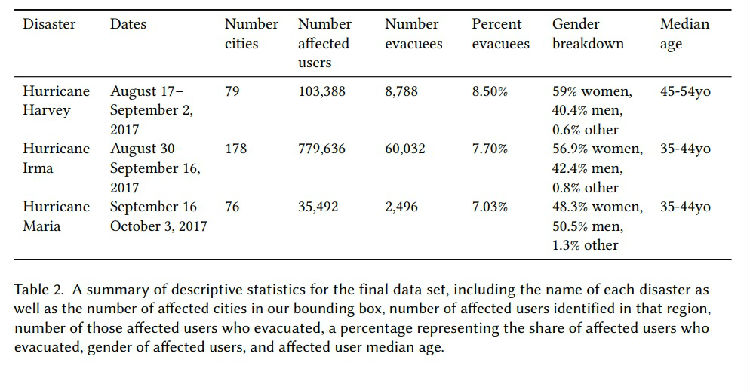 实验室接受了一个大数据项目来研究:社交媒体的影响力是否改变了长期以来关于撤离的看法。在社交媒体出现之前,有深厚社区根基的人不太可能撤离。
