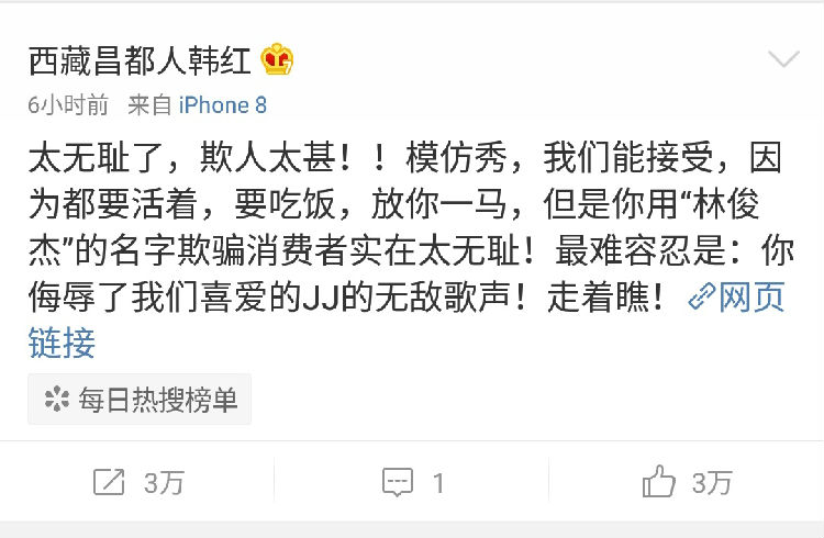 今日,韩红的微博号“西藏昌都人韩红”发文称:“太无耻了,欺人太甚!!模仿秀,我们能接受,因为都要活着,要吃饭,放你一马,但是你用“林俊杰”的名字欺骗消费者实在太无耻!最难容忍是:你侮辱了我们喜爱的JJ的无敌歌声!走着瞧!”同时还在下方评论:“你们不要误会弟弟的公司,他们一定会保护他的,放心吧!我只是看到了 新闻 ,很气愤之举。”