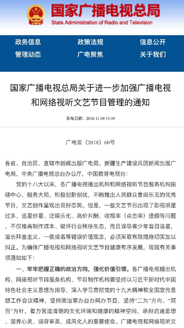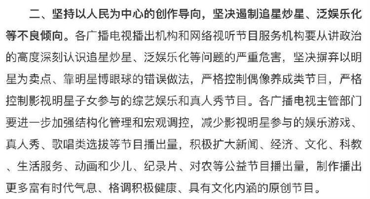 今日,国家广播电视总局发布了《关于进一步加强广播电视和网络视听文艺节目管理的通知》,为确保广播电视和网络视听文艺节目健康有序发展,纠正追星炒星、泛娱乐化、高价片酬、收视率(点击率)造假以及误导青少年盲目追星、滋长拜金主义、一夜成名等错误价值观念、问题。广电将其工作重点放在了对于娱乐、综艺节目的整治上。其中,通知中的第二点明确指出: