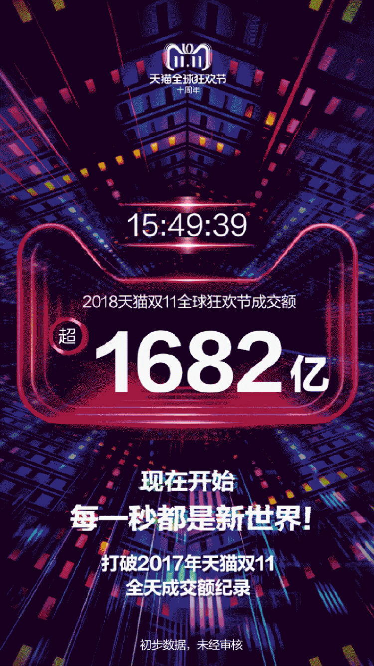 趋势网(微博|微信|熊掌号):2018年11月11日15点49分39秒,天猫双十一交易额突破1682亿元,仅用了15小时49分39秒就刷新去年的记录。