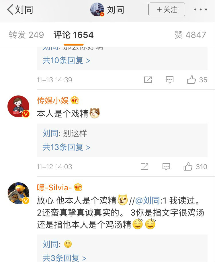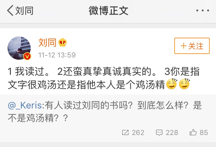 趋势网(微博|微信|熊掌号):近日有网友在微博上发文询问是否有人读过刘同的书?是鸡汤文吗?没想到引来刘同本人的回答: