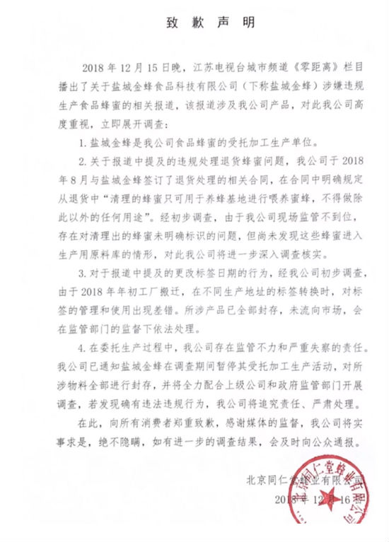 对此,北京同仁堂蜂业有限公司于今日发布《致歉声明》,以下为声明全文。